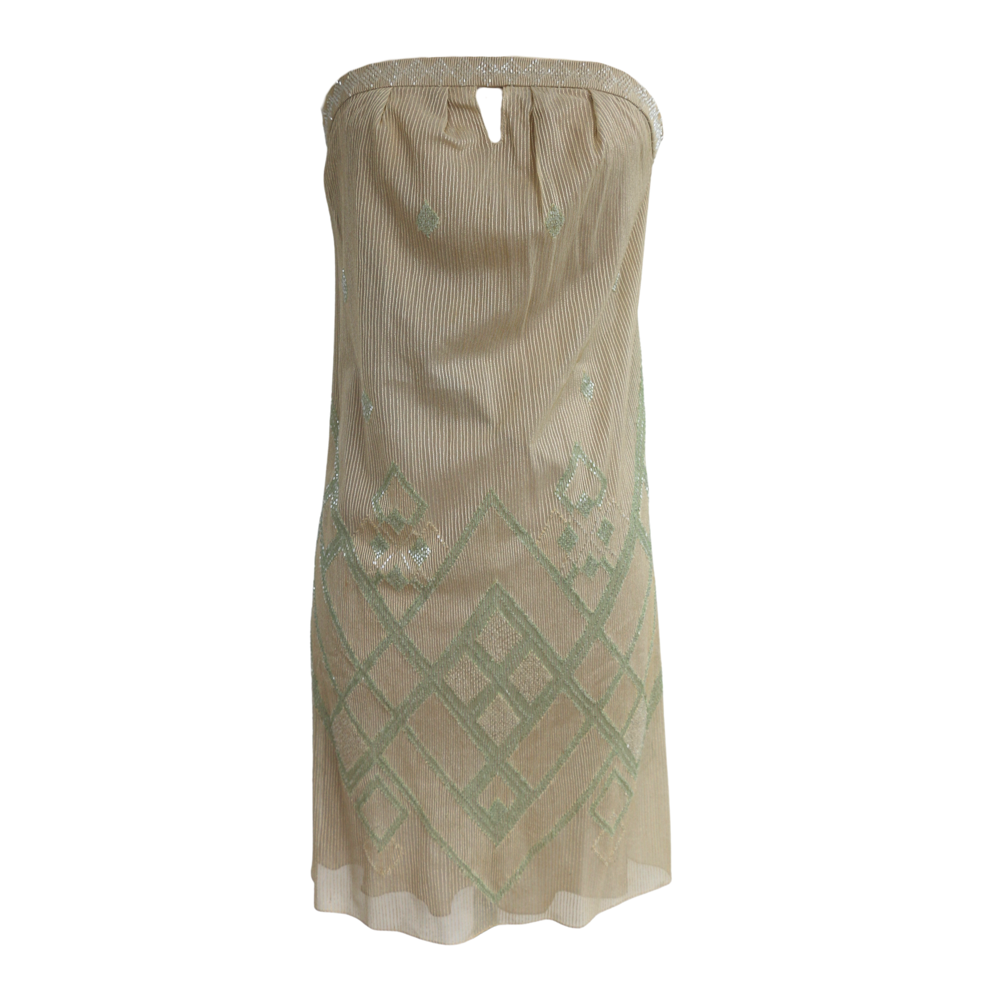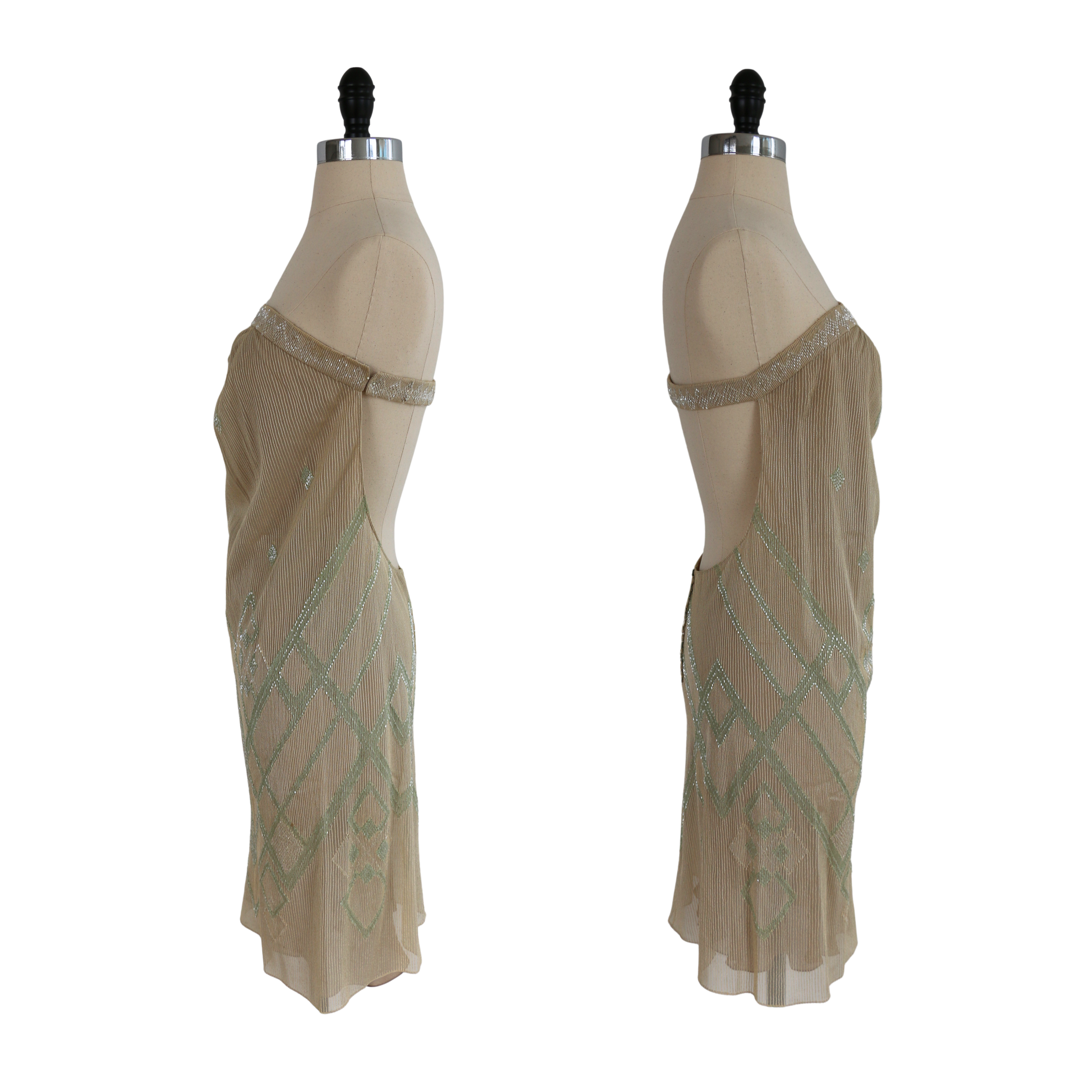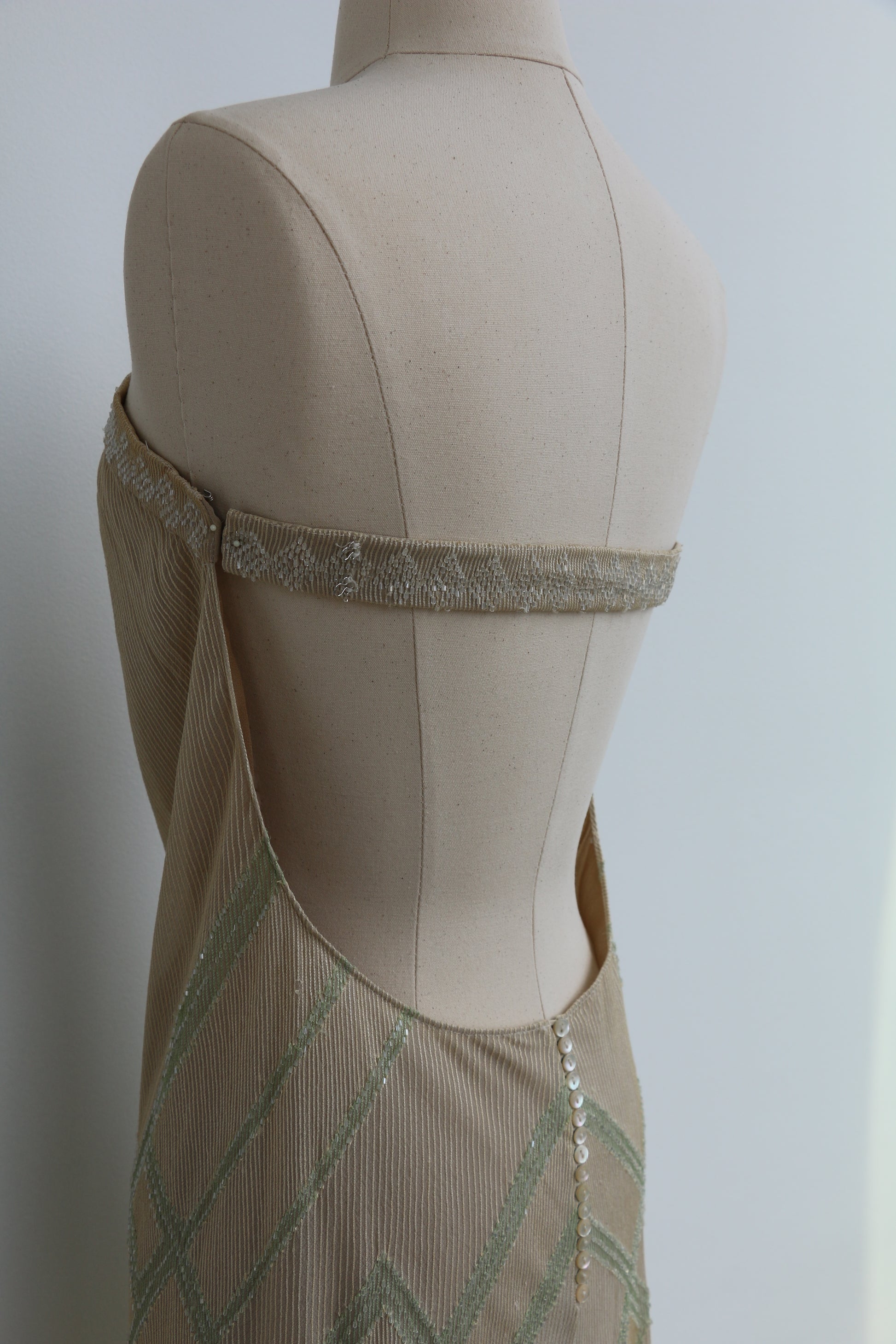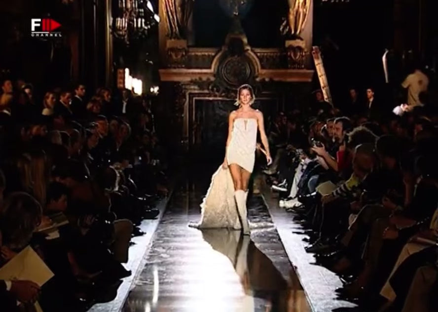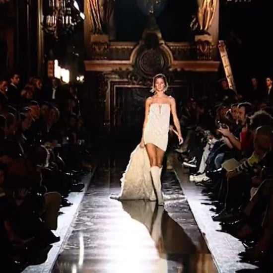 Runway opening look from Chloé FW 2000, designed by Stella McCartney. This strapless ivory mini dress features a sculptural keyhole neckline and Art Deco–inspired beading across a draped silk base. With a silhouette that recalls the glamour of Studio 54, the piece blends '70s disco references with McCartney’s signature sensual minimalism.
