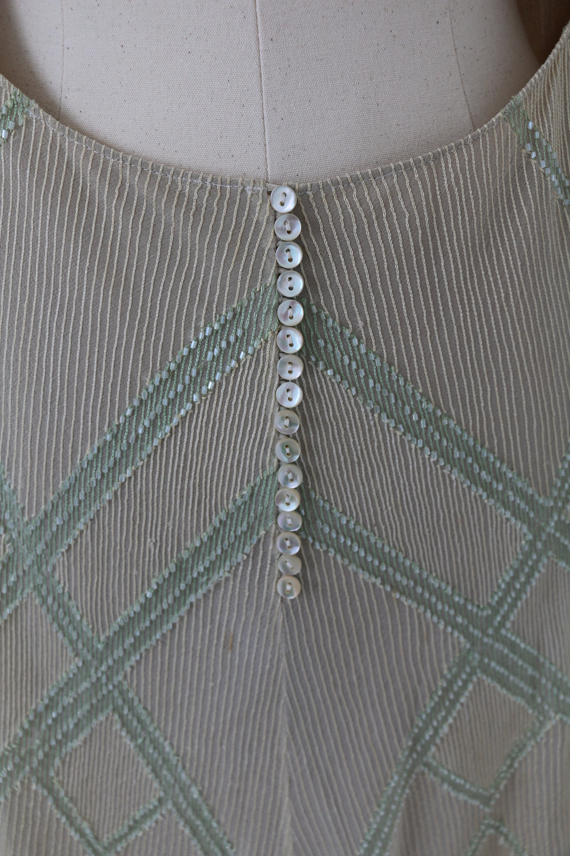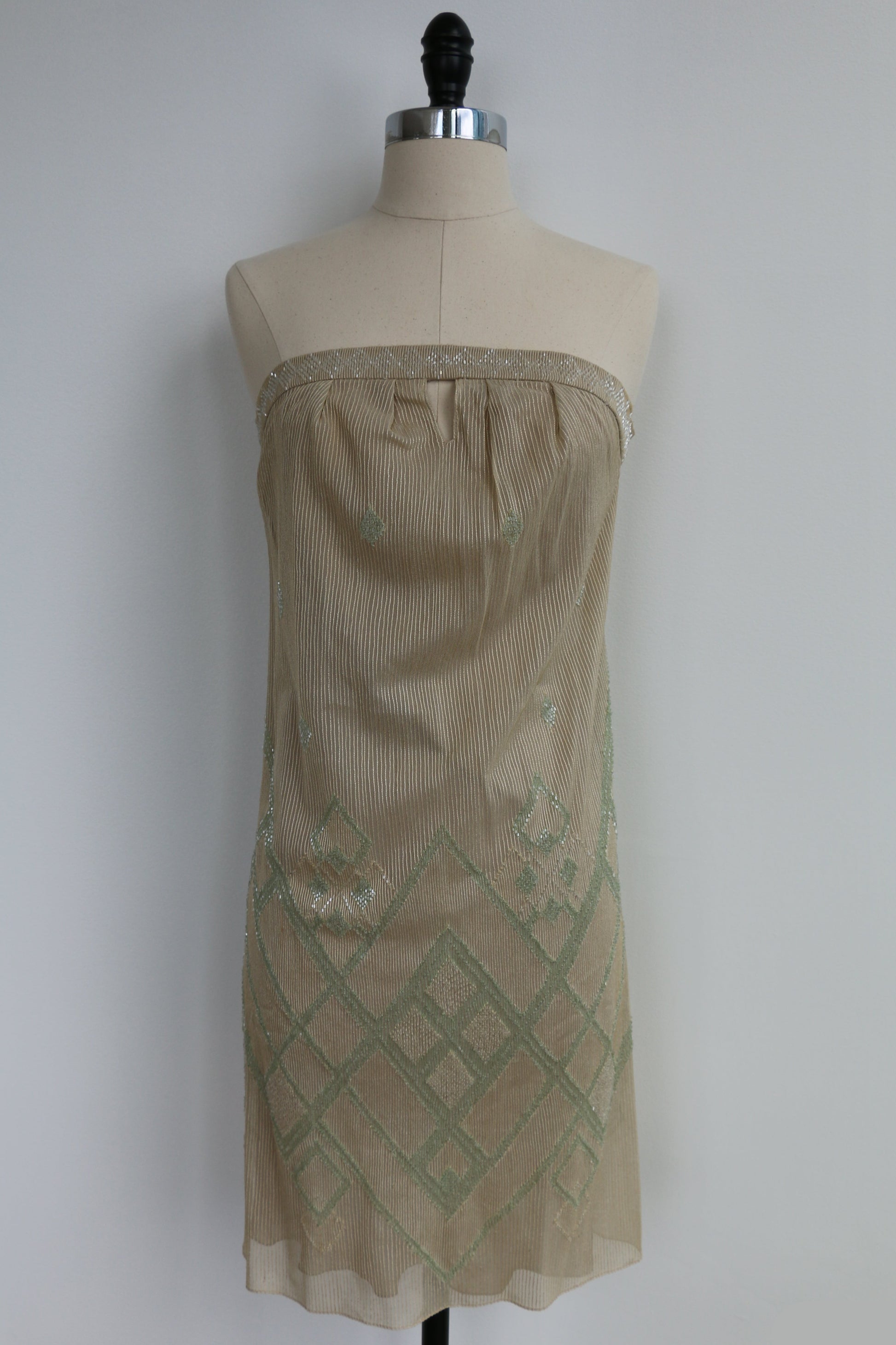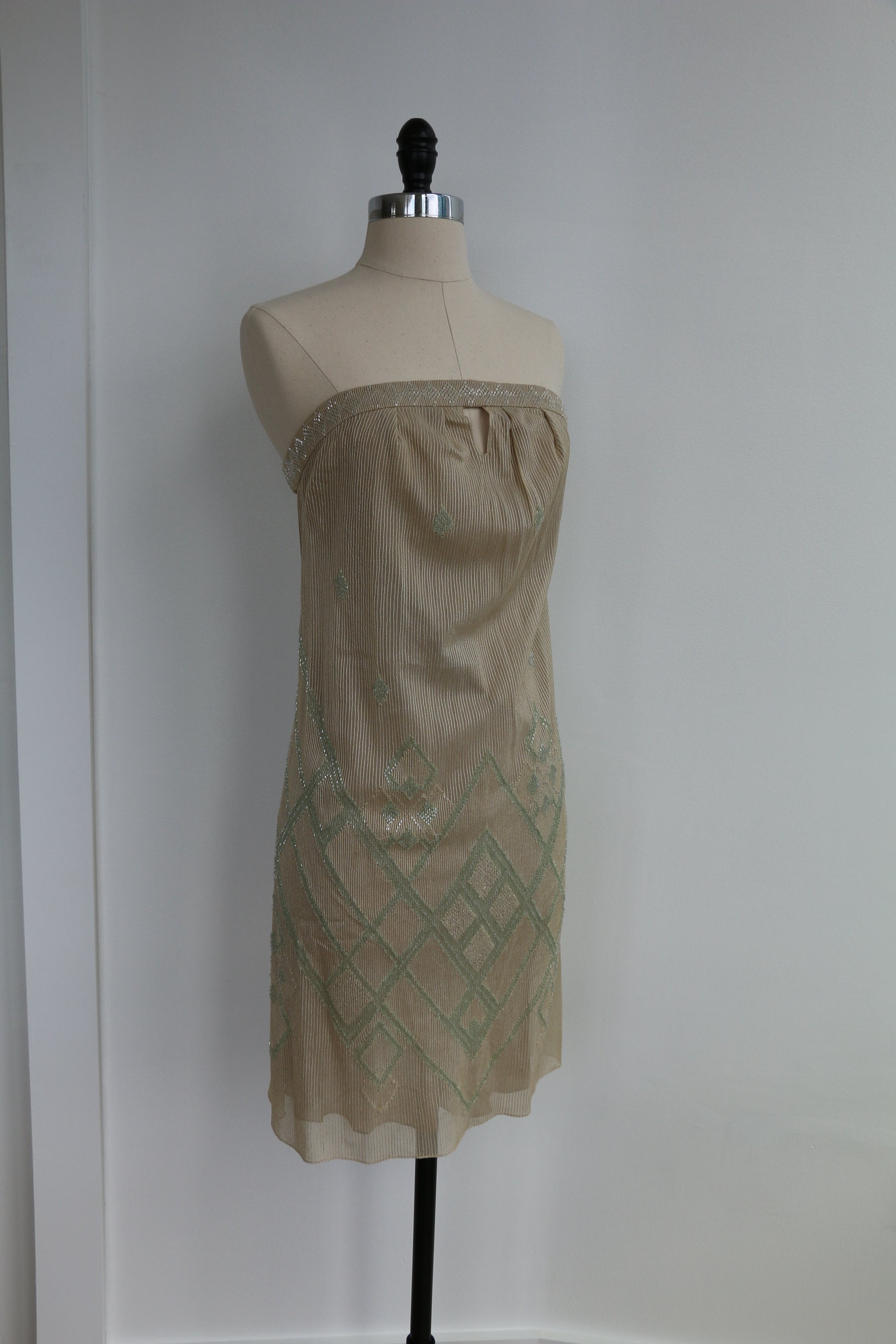 Runway opening look from Chloé FW 2000, designed by Stella McCartney. This strapless ivory mini dress features a sculptural keyhole neckline and Art Deco–inspired beading across a draped silk base. With a silhouette that recalls the glamour of Studio 54, the piece blends '70s disco references with McCartney’s signature sensual minimalism.