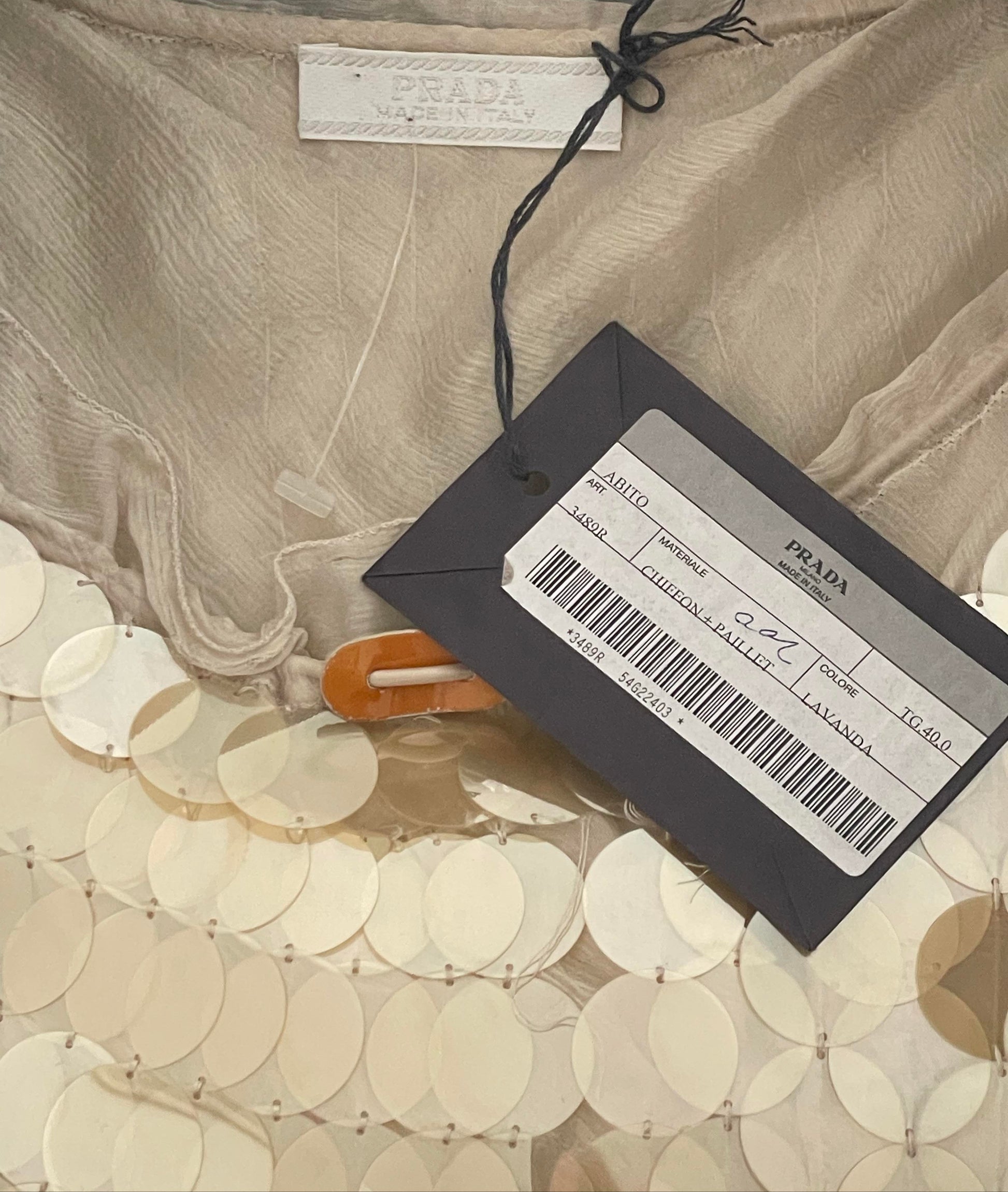 A delicate chiffon midi dress sits underneath a sea of ivory beige, light-catching paillettes from Prada's Spring Summer 1999 collection.