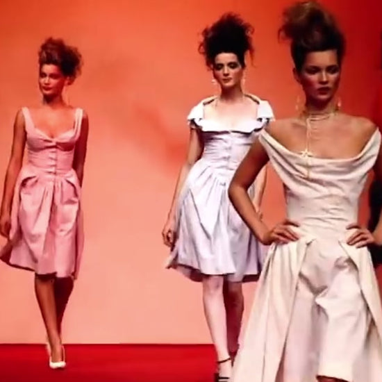 Reference: Model photographed at Vivienne Westwood's SS 1997 runway show (1), VIVIENNE WESTWOOD Spring 1997 Paris - Fashion Channel (2).
